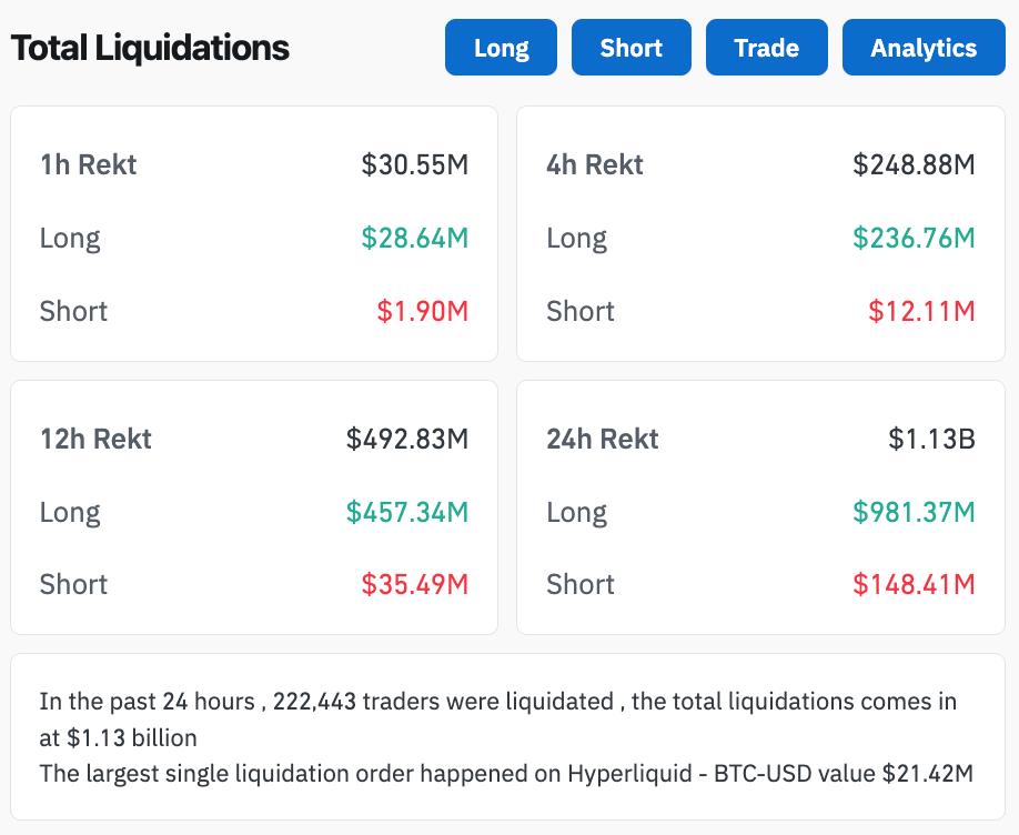The post-FOMC downturn was exacerbated by a cascade of long liquidations that punished overly bullish positioning. Within 24 hours of the Fed announcement, $1.1 billion worth of crypto futures positions were liquidated with the vast majority of them ($983 million) long bets. CoinGlass data showed about 222,436 traders hit margin calls, including a single $21 million BTC long on Hyperliquid that went up in smoke.
