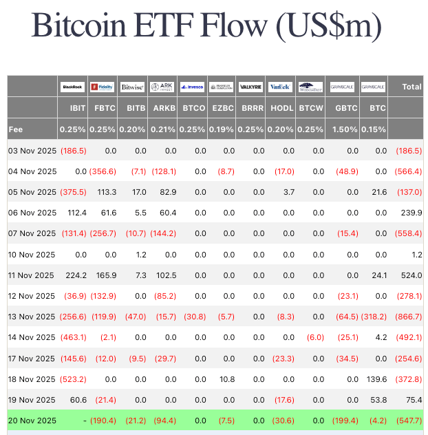 A second, very direct pressure point is the flip in U.S. spot-BTC ETF flows and broader institutional positioning. The same vehicles that steadily absorbed supply earlier in the year have swung into net selling, with roughly $1.1B leaving over a handful of sessions and about $2B bleeding out across the last three weeks. This looks less like panic and more like rules-based rebalancing: macro shifts pushed systematic models to cut BTC risk, and once that persistent ETF bid faded, the market had to reprice to find buyers.